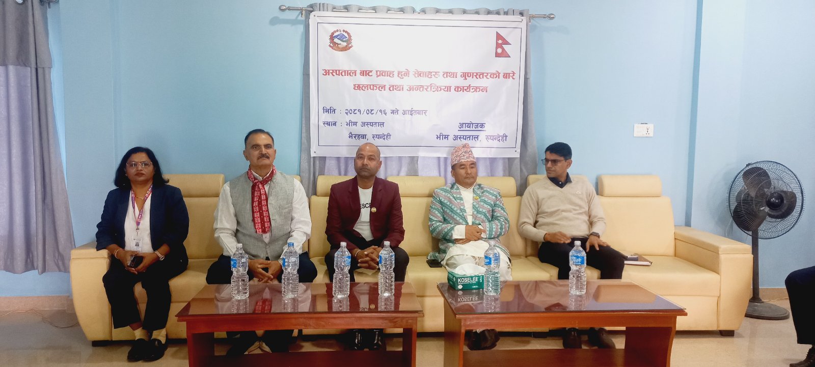 स्वास्थ्यकर्मी शेषमणि यादवले भीम अस्पताललाई राम्रो बनाउन सबै लाग्नुपर्नेमा जोड दिए । उनले यो अस्पतालको टीम राम्रो रहेको दावी गरे । स्थानीय मनिष तामाङले सरकारी अस्पतालबाट रिफर गर्न नपर्ने वातावरण बनाउनुपर्ने बताए । उनले भीम अस्पतालमा विगत भन्दा सुधार भएको बताए ।
